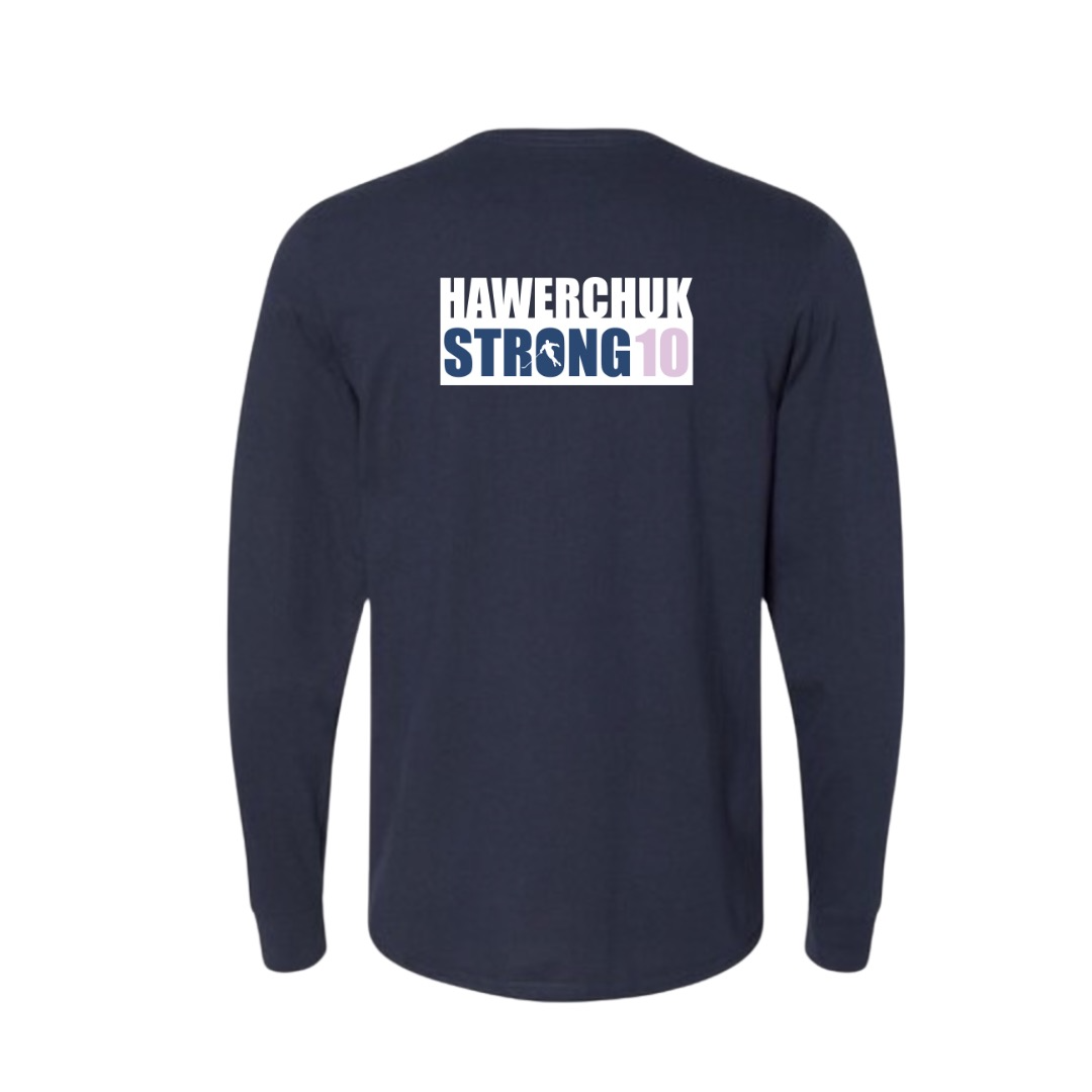 Description: Blue unisex long sleeve shirt, with Dale Hawerchuk statue silhouette on the front and Hawerchuk Strong logo on the back